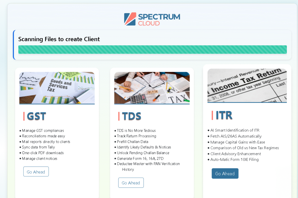 No manual uploads. No chaos. Spectrum Cloud’s Auto Scan feature automatically reads and imports all client data from your existing software – including ITR master data, GST reports, and TDS statements.